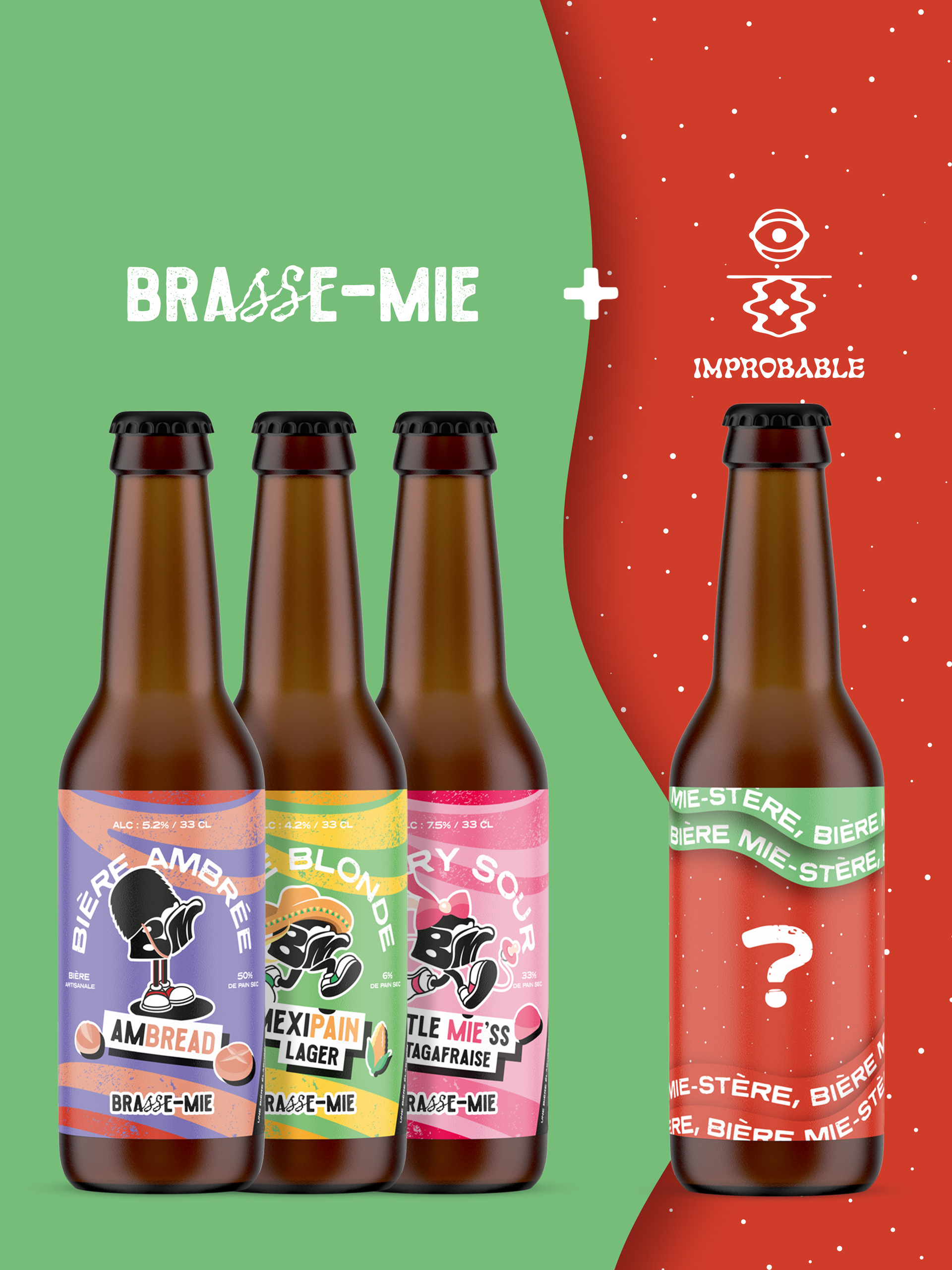 Bière artisanale Brasse-Mie Mexipain, lager blonde au pain sec, présentée sur fond jaune.Bière artisanale Brasse-Mie Mexipain, lager blonde brassée avec du pain sec en mouvement.